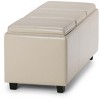 Hand constructed using solid wood, engineered wood and high density foamUpholstered with a durable Satin Cream Vegan Faux LeatherFeatures 3 flip over serving trays and large interior storageMulti-functional ottoman can be used in bedroom, living room, family room, hallway as an entryway bench, foot stool, accent furniture or provide additional sittingContemporary design includes stitching detailAssembly RequiredDimensions: 17in D x 42in W x 17in HEfforts are made to reproduce accurate colors, variations in color may occur due to computer monitor and photography