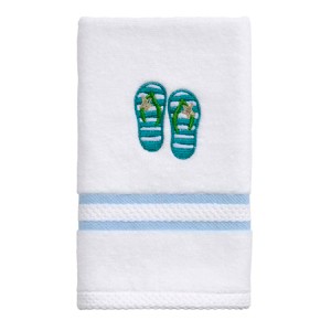 The Avanti Beach Mode Fingertip Towel is decorated with a pair of blue and green flip-flops on a white ground. 11" x 18" velour towel is 100% cotton (excl of decoration) with coordinating light blue stripes. The velour finish provides a smooth, velvety feel with a subtle sheen. Coordinating shower curtain, accessories and rug also available.