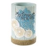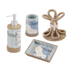 The Avanti Beachcomber 4-Piece Bath Accessory Set features items with starfish, coral and rope on a clapboard ground in shades of aqua, white and brown. Made of durable, hand-painted resin (lotion dispenser pump is plastic). Set includes 1 each of tumbler (W 3.0" x L 3.0" x H 4.25"), toothbrush holder (W 4.0" x L 4.0" x H 4.13"), soap dish (W 4.0" x L 5.25" x H 0.88"), lotion dispenser (W 3.0" x L 3.0" x H 8.0"). Coordinating towels, rug, shower curtain, bath accessories, and bedding also available.
