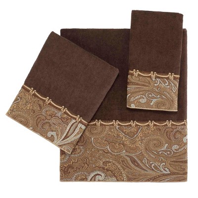 The Avanti Bradford Mineral 3-Piece Decorative Embellished Towel Set is bordered with a rich brown, blue and gold jacquard paisley fabric finished with an elegant gold and brown trim. The velour towel is 100% cotton. Includes 1 ea of bath (27" x 50"), hand (16" x 30") and fingertip (11" x 18") towel. The velour finish provides a smooth, velvety feel with a subtle sheen.