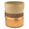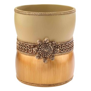 The Avanti Braided Medallion Gold Wastebasket features a two-tone color-block design of rattan and gold separated by a braid and medallion. A small braid decorates the top and bottom edges. Made of durable hand-painted resin for easy care and long life. Measures W 8.25" x L 9.75" x H 8.25". Brings an updated, modern look to almost any decor. Coordinating towels, rug, shower curtain and bath accessories also available.
