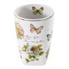 The Avanti Butterfly Garden 4-Piece Bath Accessory Set features items decorated with colorful butterfly and floral decals on an off-white base and finished with a gold line (soap dish is butterfly shape). Ceramic (lotion dispenser pump is plastic) with decal. Set includes 1 each of tumbler (W 3.0" x L 3.0" x H 4.5"), toothbrush holder (W 2.5" x L 4.25" x H 4.25"), soap dish (W 5.0" x L 5.0" x H 0.88"), lotion dispenser (W 3.0" x L 3.0" x H 7.75"). Coordinating towels, rug, shower curtain, and bath accessories also available.