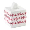 The Avanti Christmas Bows Tissue Box Cover features 3 rows of raised red ribbons with double bows, set off on a white ground. Made of durable, hand-painted resin for easy care and long life. Measures W 5.8" x L 5.8" x H 5.8". Coordinating towels, rug, shower curtain, and bath accessories also available. Perfect for the bathroom, kitchen, bedroom or office.