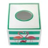 The Avanti Flamingo Paradise Tissue Cover features a decal with two pink flamingos beak-to-beak on a green and white striped background and pink hibiscus. The base is high-gloss white with a coordinating green stripe around the top border and tissue opening. Made of durable resin for easy care. Measures W 5.88" x L 5.88" x H 5.75". Coordinating towels, rug, shower curtain, and bath accessories also available.