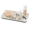 The Avanti Love Nest Decorative Vanity Tray features beautifully rendered birds sitting on branches on a decal applied to an ivory resin base. A metallic silver border wraps the outside edge. Makes a great place to put your jars, make-up, keys-works in any room in the house. Measures W 5.5" x L 10" x H 1". Coordinating towels, rug, shower curtain, and bath accessories also available.