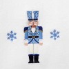 The Avanti Nutcracker Trellis 2-Pack Hand Towel Set features an embroidered nutcracker outfitted in various shades of blue with snowflakes on either side. The white 16" x 28" 100% cotton velour towels are finished with a coordinating blue polyester border. Set includes 2 towels. The velour finish provides a smooth, velvety feel with a subtle sheen. Coordinating towels, rug, shower curtain, and bath accessories also available.