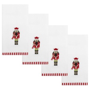 The Avanti Peppermint Nutcracker Decorative Embroidered Fingertip Towel 4-Pack features a festively dressed nutcracker in shades of red and green on a white velour ground. The 11" x 18" 100% cotton towels are finished with a white and red vertical striped polyester border. The velour finish provides a smooth, velvety feel with a subtle sheen. Coordinating towels, rug, shower curtain, and bath accessories also available.