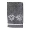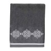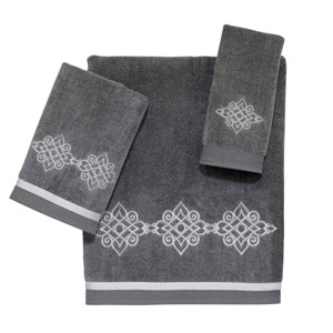 The Avanti Riverview Nickel 3-Piece Decorative Towel Set delivers a classic silver medallion embroidery with a coordinating silver ribbon trim on the bath and hand sizes. 100% cotton nickel velour towel. Set includes one each bath (27" x 50"), hand (16" x 30") and fingertip (11" x 18") towel. The velour finish provides a smooth, velvety feel with a subtle sheen.