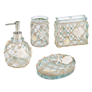 The Avanti Seaglass 4-Piece Bath Accessory Set pieces are crafted in blue-green tinted clear resin with faux rope and starfish and shells to replicate the look of real sea glass. Made of durable hand-painted resin (lotion dispenser pump is plastic). Set includes 1 each of tumbler (W 3.0" x L 3.25" x H 4.25"), toothbrush holder (W 2.5" x L 4.75" x H 4.0"), soap dish (W 4.25" x L 5.5" x H 1.25"), lotion dispenser (W 4.25" x L 4.25" x H 6.5"). Coordinating towels, rug, shower curtain, and bath accessories also available.