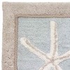 The Avanti Seaglass 20" x 30" Decorative Bathroom Rug features a white, brown and beige tufted nautical design with starfish, shells and netting on a sea blue ground. A faux rope border separates the body from the beige tray border. Finished with a non-skid latex back. Coordinating accessories, shower curtain, 24" x 60" rug and towels available.