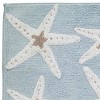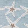 The Avanti Sequin Shells 20" x 30" Decorative Bathroom Rug features two rows of irregularly shaped white starfish with brown centers on an aqua blue ground. Non-skid latex back. Tufted in 100% cotton for softness and performance. Coordinating 24" x 60" rug, towels, shower curtain, and bath accessories also available. The perfect addition for any bathroom, kitchen or entryway.