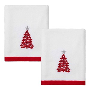 The Avanti Sparkle 2-Pack Decorative Hand Towel Set features an embroidered red Christmas tree with silver accents, white snow and a silver star on top. The two 100% cotton white velour towels are finished with matching red woven polyester border. 16" x 28" towels, machine washable. The velour finish provides a smooth, velvety feel with a subtle sheen. Coordinating towels, rug, shower curtain, and bath accessories also available.