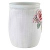 The Avanti Spring Garden Collection Wastebasket is embossed with dimensional peonies in pink and white with green leaves on an off-white textured ground. The top is finished with a beaded molding detail. Made of durable, hand-painted resin for easy care and long life. Measures W 8" x L 8.25" x H 10". Coordinating towels, rug, shower curtain, and bath accessories also available.