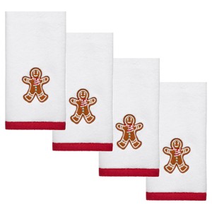 The Avanti Sweet Treat Embroidered Decorative Fingertip Towel 4-Pack features a brown, smiling gingerbread man with red and white scarf and white accents. Light blue buttons finish off this ensemble. Set includes four 11" x 18" 100% cotton white velour towels with red polyester border. The velour finish provides a smooth, velvety feel with a subtle sheen. Coordinating towels, rug, shower curtain, and bath accessories also available.