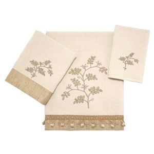 The Avanti Willow Ivory 3-Piece Towel Set features embroidered gold and taupe branches and leaves on an ivory ground. The bath and hand towels are finished with a gold and grey textured trim with braid and ball fringe added on the bath. Set includes one bath (27"x50"), hand (16"x30") and fingertip (11"x18") towel. The velour finish provides a smooth, velvety feel with a subtle sheen.