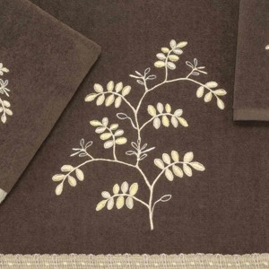 The Avanti Willow Mocha Bath Towel features embroidered gold and taupe branches and leaves on a medium brown ground. The towel is finished with a gold and grey shimmering textured trim with braid and ball fringe. The 27" x 50" 100% cotton mocha towel is sheared for a silky, smooth finish. The velour finish provides a smooth, velvety feel with a subtle sheen.