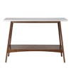 Add the bold Avenu Console Table to your living space. This all wooden mid-century inspired table will go nicely to any room’s decor. It features a white finish table top composed of engineered wood and an oak veneer bottom shelf for extra storage space. The two-tone gives this table a striking contrast. Assembly required.