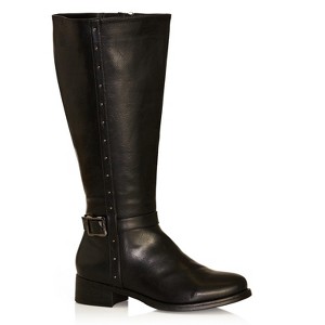 Every collection needs a go-to tall boot. Liven up any look in the faux leather finish and bronze stud embellishment of the Alex Studded Tall Boot. The wide fit will keep you comfortable all day long. Key Features Include:- Round toe boot- Zip up side closure- Cushioned Cloudwalkers insole - Elasticated insert to side - Bronze studs and buckle ankle strap- Faux leather finish - Low block heel- Wide fitFeel extremely chic with a stud-detailed tunic to match these boots.All man made materials.WIPE CLEAN WITH DAMP CLOTHImported.