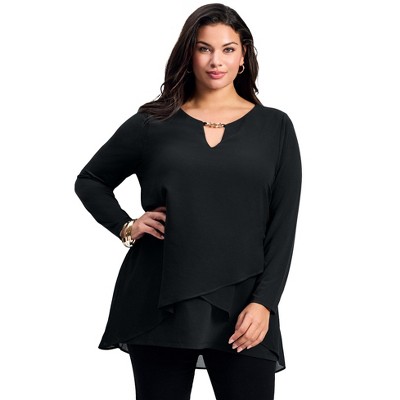 This blouse features a refined, flowing silhouette with long sleeves and gathered shoulder details for added elegance. A unique chain-link hardware accent at the neckline adds a touch of modern sophistication. Crafted from a smooth, drapey woven fabric, it’s an effortlessly polished option for day or evening looks..