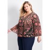 Discover the perfect balance between elegance and ease with the Harmony Top. This exquisitely crafted blouse is your new go-to for adding a touch of sophistication to any outfit. It features a placement-printed chiffon design that drapes gracefully, creating a striking visual impact with every movement. Feel the allure of its V-neckline, which draws the eye and adds a flattering touch to your silhouette. The pleated long bell sleeves flutter with a gentle grace, evoking a sense of timeless charm. And let's not forget the playful bubble hem detail that adds a hint of whimsy to your ensemble..