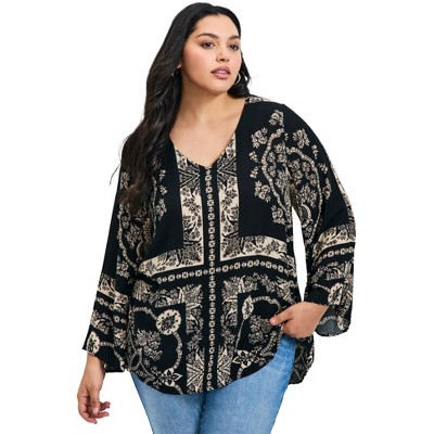 Discover the perfect balance between elegance and ease with the Harmony Top. This exquisitely crafted blouse is your new go-to for adding a touch of sophistication to any outfit. It features a placement-printed chiffon design that drapes gracefully, creating a striking visual impact with every movement. Feel the allure of its V-neckline, which draws the eye and adds a flattering touch to your silhouette. The pleated long bell sleeves flutter with a gentle grace, evoking a sense of timeless charm. And let's not forget the playful bubble hem detail that adds a hint of whimsy to your ensemble..