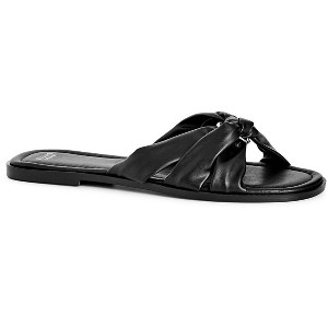 Your basics don't have to be boring. Introducing the Tanya Sandal. Keeping your feet comfortable all day long with a wide fit and cushioned soles, this slip-on pair completes your outfits with effortless style each time. Key Features Include: - Wide fit - Cushioned soles - Round open toe- Faux leather fabrication - Slip-on sandal style - Front knot design with silver hardware center Grab your go-to sunglasses and partner with a sundress.100% man-made materials.WIPE CLEAN WITH DAMP CLOTHImported.