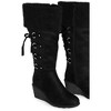 The Jamelia Tall Boot is made for chic adventures. Designed with wedge heels, faux-suede fabrication and a side zip closure, this pair is a stylish addition you'll keep coming back to each time. Key Features Include: - Rounded toe- Wedge heel - Faux-suede fabrication- Side zip closure- Lace up back - Metal eyelet and hardware detail- Fabric cuffWear with a maroon mini dress and go for bold colors.100% Man made materialsWIPE CLEAN WITH DAMP CLOTHImported.