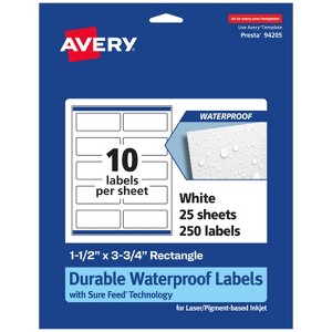 Personalize your own water-resistant labels with Avery 1.5" x 3.75" Durable Waterproof Rectangle Film Labels. Designed to withstand harsh conditions, Avery durable waterproof labels can be completely submerged in water without falling apart. Sure Feed technology prevents jams or smudges by creating a more reliable feed through your printer. The print-to-the-edge layout lets you print beautiful full-bleed designs that fill each blank sticker to the edge. The patented Easy Peel label design makes these labels easy to peel and quick to apply. These waterproof rectangle labels are compatible with both laser and pigment-based inkjet printers.* *Please Note: Avery durable waterproof labels are compatible with laser printers and pigment-based inkjet printers but are not compatible with traditional dye-based inkjet printers. Ink from dye-based inkjet printers will smear when exposed to water. Please check your printer's manual to confirm if you are using pigment-based ink.