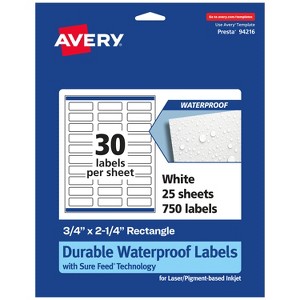 Personalize your own water-resistant labels with Avery .75" x 2.25" Durable Waterproof Rectangle Film Labels. Designed to withstand harsh conditions, Avery durable waterproof labels can be completely submerged in water without falling apart. Sure Feed technology prevents jams or smudges by creating a more reliable feed through your printer. The print-to-the-edge layout lets you print beautiful full-bleed designs that fill each blank sticker to the edge. The patented Easy Peel label design makes these labels easy to peel and quick to apply. These waterproof rectangle labels are compatible with both laser and pigment-based inkjet printers.* *Please Note: Avery durable waterproof labels are compatible with laser printers and pigment-based inkjet printers but are not compatible with traditional dye-based inkjet printers. Ink from dye-based inkjet printers will smear when exposed to water. Please check your printer's manual to confirm if you are using pigment-based ink.