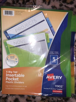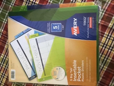 [This review was collected as part of a promotion.] The Avery® Big Tab™ Insertable Plastic Dividers with Pockets, 5-Tab Set are a huge help in keeping organized! I love that they're different colors, so I can color cordinate. The tabs are big enough to write on if needed. The pockets hold a standard piece of paper. I fell in love with these!
