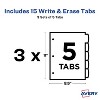 These Big Tab Write & Erase Durable Plastic Dividers let you write, erase and reuse your ring binder dividers for easy changes at any time. Simply write directly on the stylishly shaped tabs with a ballpoint pen or pencil, and erase as needed. You can also take quick notes on the 8-1/2" x 11" plastic divider body and easily erase later. Made from ultra-durable, tear-resistant plastic, these dividers can be wiped clean with most non-abrasive household cleaners and are ideal for frequent use in any 3 ring binder. The Big Tab design offers 1.5 times more writing space than standard 3 ring binder dividers with tabs, and the multiple bright colors allow for quick referencing. Ideal for your personal organization at home, work and school. This item comes with 3 sets of 5-tab binder dividers for a total of 15 multicolor dividers.