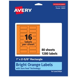 Design your own high-visibility labels with vibrant, bright colors with Avery Bright Orange Rectangle 1" x 2-5/8" Labels. Created with brilliantly eye-catching bright orange label material, these vivid labels will immediately grab people's attention so that you can easily make your own mailing labels, candle labels, soap labels, and more! The bright color is perfect whether you need to create warnings, organize inventory, or make sure your product labels stand out on a shelf. Sure Feed technology reduces printer jams by creating a more reliable feed through your printer. The print-to-the-edge layout allows you to create full-bleed artwork that allows the bright label color to peek through gaps in your design and it also lets you add in borders that fill the edges without any empty spaces.