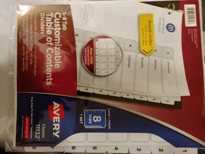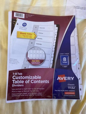 Avery Ready Index Binder Dividers, Customizable Table of Contents, 8-Tab, helps stay organized to locate important documents quickly and easily. They feature preprinted alphabetical or numerical tabs that are reinforced for durability and can be used in either landscape or portrait format. Using free templates from Avery Design & Print, you can customize the included title page and print in minutes.