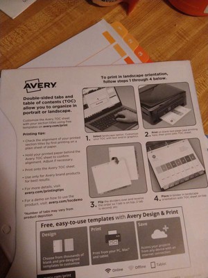 [This review was collected as part of a promotion.] Love the large and colorful index and the tabs are brightly colored and easy to read. Avery offers templates for many of their products and this is no exception. It has instructions on how to print directly on the index so you don't have to worry about messy handwriting or smeared ink. Helps for great organization.