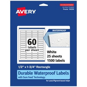 Personalize your own water-resistant labels with Avery .5" x 1.75" Durable Waterproof Rectangle Film Labels. Designed to withstand harsh conditions, Avery durable waterproof labels can be completely submerged in water without falling apart. Sure Feed technology prevents jams or smudges by creating a more reliable feed through your printer. The print-to-the-edge layout lets you print beautiful full-bleed designs that fill each blank sticker to the edge. The patented Easy Peel label design makes these labels easy to peel and quick to apply. These waterproof rectangle labels are compatible with both laser and pigment-based inkjet printers.* *Please Note: Avery durable waterproof labels are compatible with laser printers and pigment-based inkjet printers but are not compatible with traditional dye-based inkjet printers. Ink from dye-based inkjet printers will smear when exposed to water. Please check your printer's manual to confirm if you are using pigment-based ink.