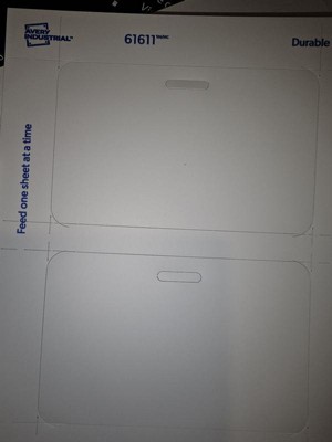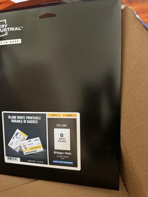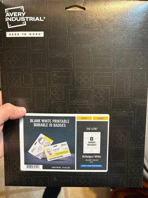 Avery Industrial wide/horizontal oriented ID badges come in printable sheets that break apart into credit-card sized badges with rounded corners and a clip hole. This package includes 10 printable sheets that break into 8 cards each for a total of 80 badges/cards that are 2.125" x 3.375". Our printable ID badges are made from durable polyester (PET) designed for use in heavy-duty work spaces. Waterproof and resistant to tearing, chemicals and UV, our 11 mil durable name badges work perfectly for personalized name tags and name badges for industrial facilities. Horizontal ID badges feature a hole for lanyard and bulldog clips– no badge holder necessary. The clip hole is extremely durable, resisting up to 35 pounds of pull force. Our printable name tags are printable on both sides using a standard laser printer. Access a wide variety of free customizable templates on the Avery site.