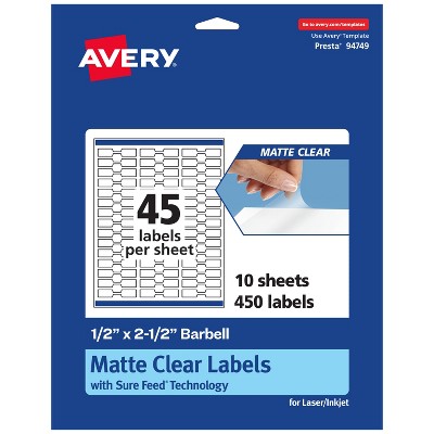 Create labels that are absolutely clear with Avery .5" x 2.5" Glossy Clear barbell Labels. Clear as glass with a reflective shine, Avery glossy clear labels vanish when applied to glass and metal surfaces. The transparent and glossy label material is also perfect for making the colors in your design pop and look even more vibrant on lighter surfaces. Sure Feed technology prevents jams or smudges by creating a more reliable feed through your printer. The strong permanent label adhesive makes sure that your labels stick and stay to a variety of surfaces.