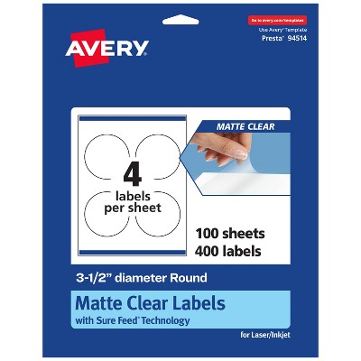Create labels that are absolutely clear with Avery 3.5" diameter Glossy Clear round Labels. Clear as glass with a reflective shine, Avery glossy clear labels vanish when applied to glass and metal surfaces. The transparent and glossy label material is also perfect for making the colors in your design pop and look even more vibrant on lighter surfaces. Sure Feed technology prevents jams or smudges by creating a more reliable feed through your printer. The print-to-the-edge layout lets you print beautiful full-bleed designs that fill each blank sticker to the edge. The patented Easy Peel label design makes these labels easy to peel and quick to apply. Just bend the label sheet, peel off your labels and fold the sheet back flat. The strong permanent label adhesive makes sure that your labels stick and stay to a variety of surfaces.