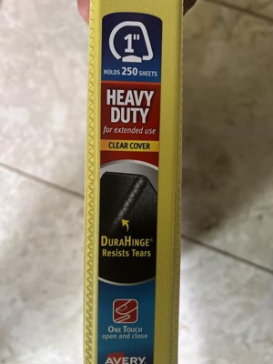 [This review was collected as part of a promotion.] The heavy-duty Clearview three ring binder by Avery one inch binder slant rings in the color bright yellow is a great addition to your child's School needs. It is heavy duty can be thrown around or accidentally dropped. Her text the loose leaf paper which is a huge Plus. Easy one touch button to open and close the clamps