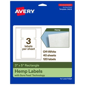 Bring your coffee bag labels, canning labels, bakery labels, and more to life with customizable Avery 3" x 5" Rectangle Hemp Labels. Made with 25% hemp fiber and 75% recycled paper, these sticker labels bring sustainability and style together in one thoughtful design. The unbleached kraft label liner helps conserve resources and limit chemical processing, while the off-white, speckled appearance offers an organic, handcrafted look. Backed by permanent adhesive, labels stay in place without lifting or peeling; plus, it is recycling compatible so it won't interfere with the paper recycling process. With Pop-Up Edge technology, label edges lift for easy peeling and a faster application. Sure Feed technology reduces jams or misalignments by creating a more reliable printer feed. The print-to-the-edge layout lets you create bold, full-bleed designs. Optimized for laser and inkjet printers, each 8.5" x 11" sheet provides clean, consistent results for reliable printing performance.