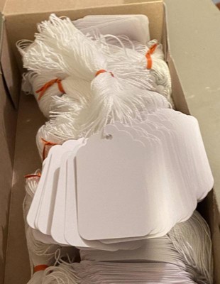 - General purpose marking tags made of durable, long-lasting cardstock and strung with white string for easy attachment to items