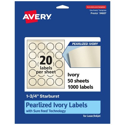 Add an elegant touch to home organization labels, price labels, reward stickers for kids, certificate seals, decorative labels, mailing seals, planner stickers and more with Avery 1.75" Matte White Removable Starburst Labels. Made with matte white paper and removable adhesive, the removable Avery labels stick and stay but remove cleanly. Apply these removable white labels to smooth surfaces such as paper, plastic, cardboard, glass, or metal and peel them away without leaving behind messy residue. Sure Feed technology reduces jams or smudges by creating a more reliable feed through your printer. The print-to-the-edge layout lets you print beautiful full-bleed designs that fill each blank sticker to the edge. The dual-compatible printable labels are compatible with both laser printers and inkjet printers. Easily customize labels with your own designs, art, symbols, and messaging in Avery Design & Print.