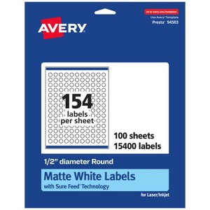 Matte white Avery round labels are perfect for any project. Each sheet of labels features Sure Feed(R) technology which helps deliver a more reliable feed through your printer to prevent print misalignments and paper jams. The print-to-the-edge feature makes it easy to print beautiful designs that can reach the edges of the label without a border or outline. A strong permanent adhesive is used to make sure that these labels stick to paper, cardboard, plastic, glass, metal and more without curling or falling off. Avery Design & Print makes it easy to create custom labels with your laser or inkjet printer. Our browser-based software includes tools for editing text and images so that you can create pricing labels, event labels, beauty labels and more. Try it today by searching for Avery template Presta 94503 at avery.com/templates.