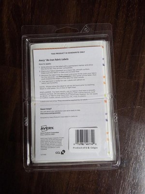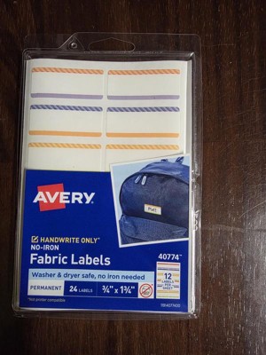 Easily create your own fun name tags for clothes, name labels for kids, daycare labels and more by using Avery 40706 No-Iron Fabric Labels with preprinted rainbow border designs. These brilliantly colorful preprinted fabric labels feature a vibrant collection of rainbow-colored borders. No iron is required, just write, peel and stick fabric labels onto clothing for instantly permanent clothing tags. The sturdy permanent adhesive sticks firmly and won't peel or lift. The adhesive bonds to the fabric with a firm grip so that the labels won't wash away even after multiple cycles in a washer and dryer. For best results, use permanent markers to keep your writing readable after multiple washes and to withstand everyday wear and tear. Each label is .75" x 1.75" and 2 sheets are included with 12 labels per sheet.