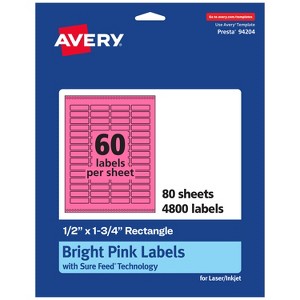 Design your own high-visibility labels with vibrant, bright colors with Avery Bright Pink Rectangle 0.5" x 1.75" Labels. Created with brilliantly eye-catching bright pink label material, these vivid labels will immediately grab people's attention so that you can easily make your own small cosmetic labels, spice jar labels, barcode labels, and more! The bright color is perfect whether you need to create warnings, organize inventory, or make sure your product labels stand out on a shelf. Sure Feed technology reduces printer jams by creating a more reliable feed through your printer. The print-to-the-edge layout allows you to create full-bleed artwork that allows the bright label color to peek through gaps in your design and it also lets you add in borders that fill the edges without any empty spaces.