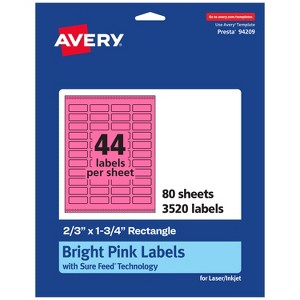 Design your own high-visibility labels with vibrant, bright colors with Avery Bright Pink Rectangle 2/3" x 1-3/4" Labels. Created with brilliantly eye-catching bright pink label material, these vivid labels will immediately grab people's attention so that you can easily make your own body scrub labels, spice jar labels, pricing labels, and more! The bright color is perfect whether you need to create warnings, organize inventory, or make sure your product labels stand out on a shelf. Sure Feed technology reduces printer jams by creating a more reliable feed through your printer. The print-to-the-edge layout allows you to create full-bleed artwork that allows the bright label color to peek through gaps in your design and it also lets you add in borders that fill the edges without any empty spaces.