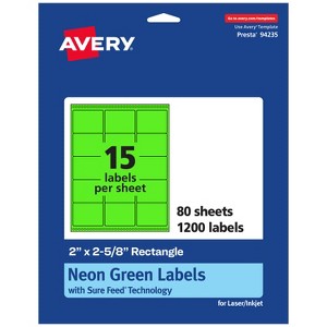 Design your own high-visibility labels with vibrant, bright colors with Avery Neon Green Rectangle 2" x 2-5/8" Labels. Created with brilliantly eye-catching neon green label material, these vivid labels will immediately grab people's attention so that you can easily make your own mailing labels, pricing labels, spice jar labels, and more! The fluorescent color is perfect whether you need to create warnings, organize inventory, or make sure your product labels stand out on a shelf. Sure Feed technology reduces printer jams by creating a more reliable feed through your printer.