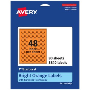 Design your own high-visibility labels with vibrant, bright colors with Avery Bright Orange Starburst 1" Labels. Created with brilliantly eye-catching bright orange label material, these vivid labels will immediately grab people's attention so that you can easily make your own decorative labels, pricing labels, mailing seals, planner stickers, and more! The bright color is perfect whether you need to create warnings, organize inventory, or make sure your product labels stand out on a shelf. Sure Feed technology reduces printer jams by creating a more reliable feed through your printer. The print-to-the-edge layout allows you to create full-bleed artwork that allows the bright label color to peek through gaps in your design and it also lets you add in borders that fill the edges without any empty spaces.