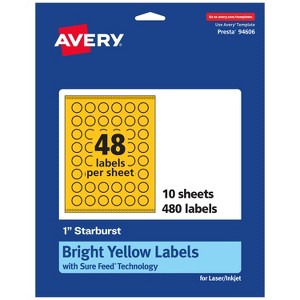 Design your own high-visibility labels with vibrant, bright colors with Avery Bright Yellow Starburst 1" Labels. Created with brilliantly eye-catching bright yellow label material, these vivid labels will immediately grab people's attention so that you can easily make your own decorative labels, pricing labels, mailing seals, planner stickers, and more! The bright color is perfect whether you need to create warnings, organize inventory, or make sure your product labels stand out on a shelf. Sure Feed technology reduces printer jams by creating a more reliable feed through your printer. The print-to-the-edge layout allows you to create full-bleed artwork that allows the bright label color to peek through gaps in your design and it also lets you add in borders that fill the edges without any empty spaces.