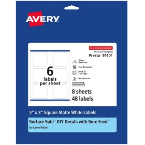 Add a personal touch to packaging labels, gift box labels, food labels and more with Avery 3" x 3" Durable Removable Matte White Square Labels. Made from water-resistant, tear-resistant, and UV-resistant film, these durable labels can stand up to tough conditions. They’re also oil-resistant for some oils, such as argan, avocado, coconut, and rosehip. (Please test before use if oil resistance is needed.) Plus, the label stickers are freezer- and microwave-safe, and backed by removable adhesive that sticks securely to smooth surfaces, yet peels away cleanly with no messy residue. (Note: removable adhesive may tear paper surfaces.) Sure Feed technology reduces jams or smudges by creating a more reliable feed through your printer. The print-to-the-edge layout lets you print beautiful, full-bleed designs that fill each blank sticker to the edge.